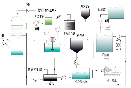采用石灰石或石灰作为脱硫吸收剂,石灰石经破碎磨细成粉状与水混合搅拌成吸收浆液,当采用石灰为吸收剂时,石灰粉经消化处理后加水制成吸收剂浆液。在吸收塔内,吸收浆液与烟气接触混合,烟气中的二氧化硫与浆液中的碳酸钙以及鼓入的氧化空气进行化学反应从而被脱除,最终反应产物为石膏。